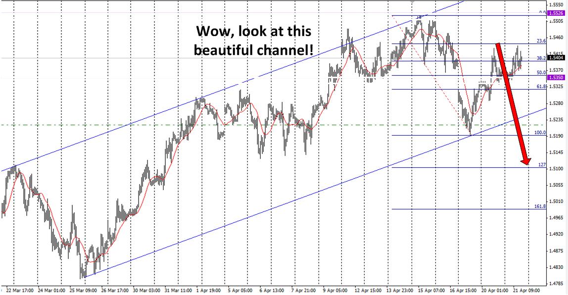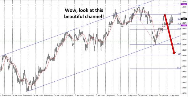 Two days ago, I wrote, “If the GBP/USD does not immediately take out 1.5128, then you could safely place a limit sell anywhere from 1.5375 to 1.5475”. Look where the GBP/USD has been oscillating for the past 12 hours….1.5340 to 1.5430. Now, within the next 24 hours, we should see the GBP/USD begin its descent for the next month, two, or three. I also want to show this beautiful channel which the GBP/USD has been in. You’ll also notice that the GBP/USD has hit the 78.6 fib, which points it to an immediate potential target of 1.5102. For an immediate short-term goal, that’s a nice 280 pips over the next couple of days. Here’s the picture of the beautiful channel the GBP/USD has been in: