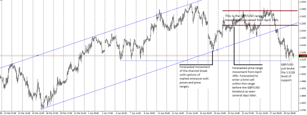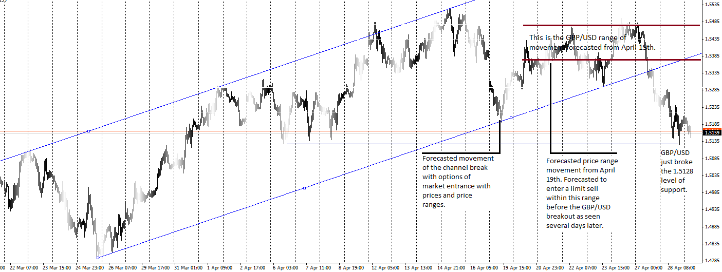 On April 19th (9 days ago), I wrote, “If the GBP/USD does not immediately take out 1.5128, then you could safely place a limit sell anywhere from 1.5375 to 1.5475″. Then on April 21st, I posted, “Now, within the next 24 hours, we should see the GBP/USD begin its descent for the next month, two, or three.” On my forecast I was a little off on 2 things: