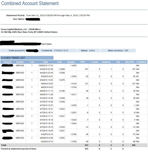 Right now, I’m only trading the GBP/USD. I really like it, and enjoy trading it. For the month of April, I made a Net total of 609 PIPs on 1 LOT…of which all of the trades were on the GBP/USD. Here is a snapshot of the trades I took within my account. If you’d like, subscribe to my blog and you’ll receive email notifications of when I recommend trades.
