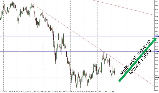 Now that it has retraced a bit to a strong level of support, it will begin its movement up toward 1.5000.