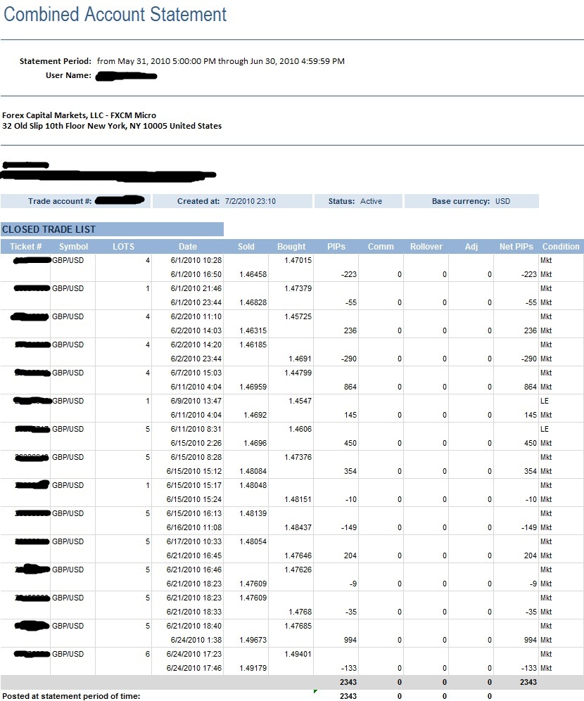 2,343 Net Total PIPs for the Month of June Posted on July 3, 2010 by LattePIPs Leave a comment Well, my trade recommendations were a lot better than my actual trading for the month of June. Here’s a snapshot of my trades and account for the month of June. June 2010 Report Share this: Share on Facebook (Opens in new window) Facebook Share on X (Opens in new window) X Like Loading... Related
